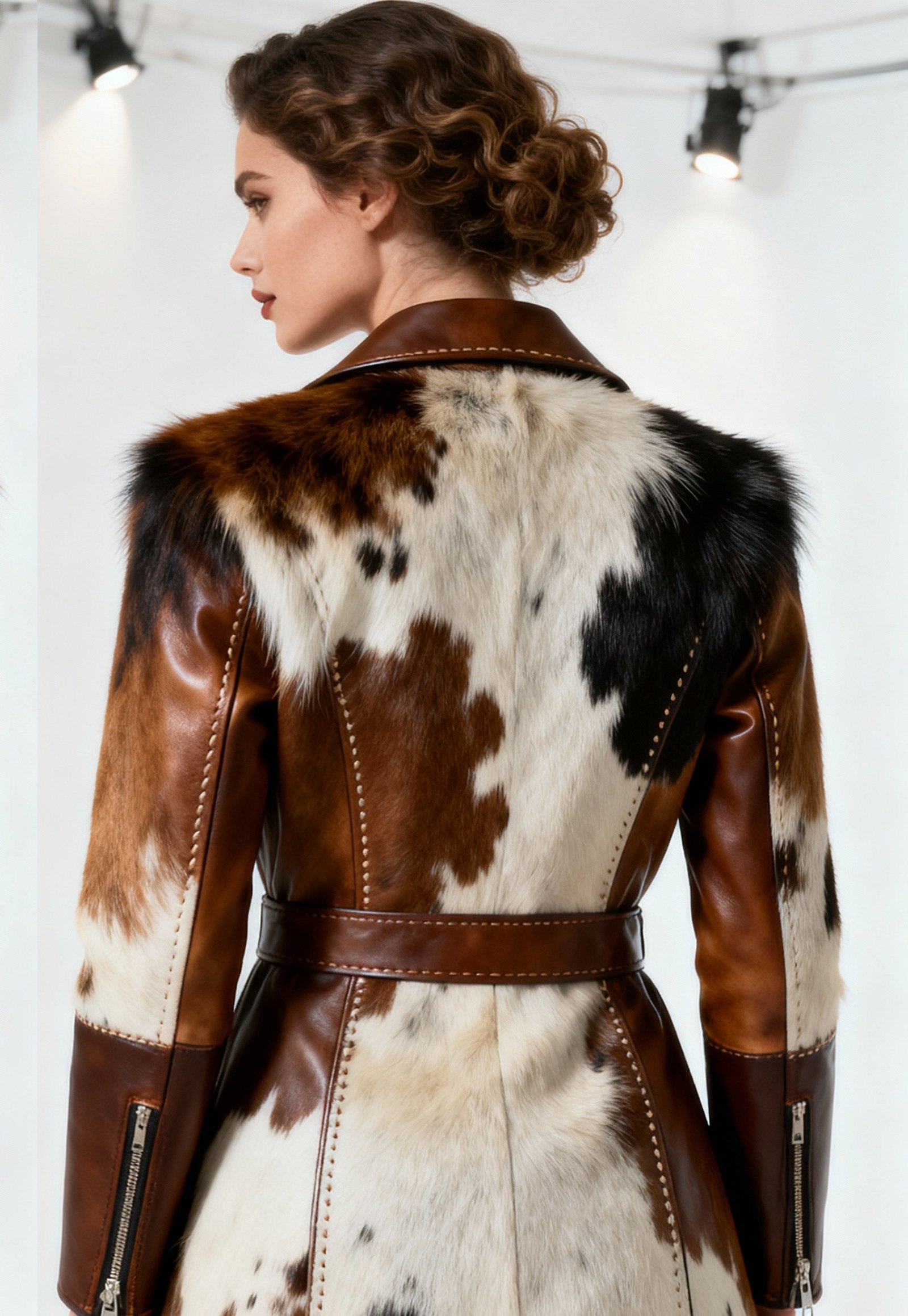 Each piece is cut from genuine natural cowhide, preserving its unique hair texture and color pattern. No two jackets are ever the same — each tells its own story of wilderness, artistry, and individuality.